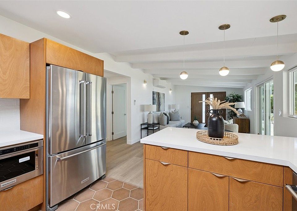 Inside, the 1,100 sq ft layout has been reimagined with open, light-filled living spaces and elevated finishes throughout. The kitchen features custom birch wood cabinetry, Arctic White Quartz countertops, and a Bedrosians Clara matte white backsplash paired with terra cotta tile and coordinating flooring. Brushed nickel fixtures and premium KitchenAid appliances complete the space with style and function. Bathrooms are finished with Delta brushed gold hardware, Zellige ceramic tile, and Hudson Valley sconces, creating a refined, spa-like atmosphere. Two ensuite bedrooms offer privacy and luxury, including one with a spacious walk-in closet and soaking tub. Additional highlights include designer sconce lighting, Troy collection mirrors from Lightopia, and two new climate-control mini splits for year-round efficiency.