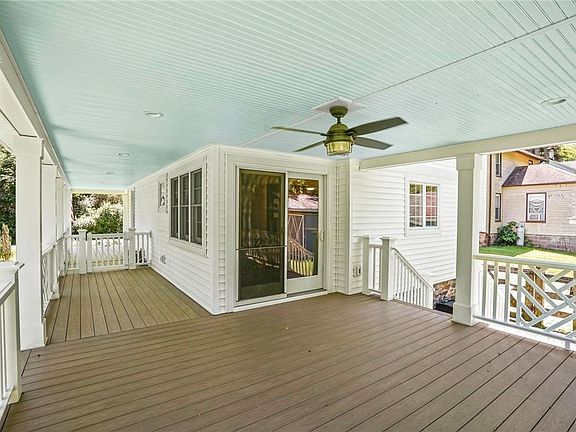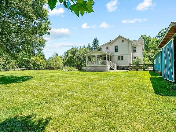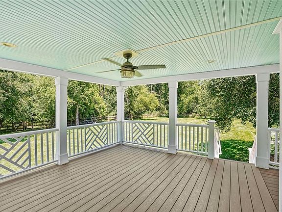 Beautifully renovated 3-bedroom, 2.5-bathroom modern farmhouse effortlessly combines the traditional charm w/ contemporary design elements. The crisp, classic white exterior features a spacious & inviting wraparound porch and a covered deck (totaling 700 square feet) overlooking the fenced-in, flat yard just under 3/4 of an acre w/gardening beds. The kitchen is a chef's dream, boasting white custom cabinets, a large island w/ barstool seating, quartz countertops, farmhouse sink, subway tile backsplash, stainless steel appliances, slate floors w/ radiant heating, & a rustic, custom-built kitchen table & seating area. Sliding doors lead to the oversized covered porch. The first floor's open floorplan features original wide-plank pumpkin pine flooring, spacious living room w/deep-set windows and elegant molding, & a versatile space that can serve as a dining room/office, along with a powder room. 2nd floor includes 3 BRS & 2 full baths w/ an en suite MBR w/ radiant floor heating in the bathroom, custom shelving & a closet area. Modern conveniences include NEW central air conditioning, a new whole-house generator, new water softener and