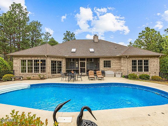 Pinewild custom built residence exhibits distinctive architecture that is finely crafted and designed with attention to detail inside and out. Perfect for entertaining - hardwood floors flow through living areas and multiple doors spill onto screened porch and patio with in-ground pool surrounded with black metal fence. Foyer flanked by dining room and formal living. Gourmet kitchen boasts granite countertops, island with seating and stainless steel appliances. Family room with fireplace and custom built ins. The impressive primary bedroom suite includes large walk in closet, separate sinks, shower, and soaking tub.Two additional bedrooms share second bathroom. Half bath near laundry room. 2 car garage. Original owners.