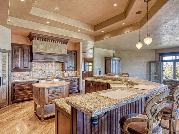 This 6924 SF home is a work of art w/quality craftsmanship & panoramic views! Situated on 26.55 ACs, the scenic views are simply breathtaking! Sophisticated features throughout include soaring ceilings & custom walnut barrel-vaulted ceiling, massive beams, hand-stacked stone fireplaces & walls, custom cabinets, reclaimed wood floors, Italian tile floors, skimmed coated plaster walls, granite & soapstone counters, luxury lighting, wine storage, generator, large windows w/picturesque views from most every room! Luxury living areas include Primary Bedroom Suite w/ensuite Bath & large walk-in closet, 2 additional Bedroom Suites, Formal Living & Dining Rooms, Family & Theater Rooms, Gourmet Kitchen w/Nook, Wine Storage, Office, Laundry Room, Guest Bath, Bonus Room, & a 3-car Garage. Separate 600 SF Carriage House w/2-car garage. Outdoor living spaces include stone patios, custom iron fencing, fire pit & manicured landscaping surrounded by groomed forest w/trails & wildlife. Move in ready!