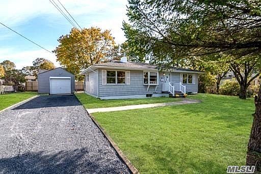 SUN SHINES ON THIS RANCH HOME W/DETACHED GARAGE. OPEN FLOOR PLAN LIVING & DINING ROOM. UPDATED EAT-IN-KITCHEN W/HIGH-HATS AND OPENS OUT TO SPACIOUS PATIO. MASTER EN-SUITE W/VAULTED CEILING AND WALK-CLOSET WITH FULL BATH. MAIN FULL BATH AND 2 BEDROOMS. LOWER LEVEL DEN W/HIGH-HATS AND OUTSIDE ENTRANCE. LAUNDRY ROOM OFFERS SPACIUOS HIDDEN STORAGE AND UTLITY ROOM W/ ADDITIONAL STORAGE. MINUETS TO EXPRESSWAY, TRAIN, AIRPORT, STONYBROOK, SHOPPING AND DINING.....