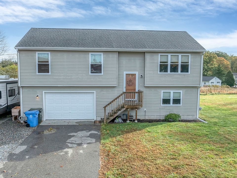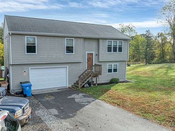 Built in 2012 on a level 1.1-acre lot along a scenic country road, this impeccably maintained 3-bedroom, 2-bath Raised Ranch offers the perfect blend of modern comfort and peaceful country charm. A spacious one-car garage, large pressure-treated deck, and above-ground pool with its own entertaining deck make this home ideal for both relaxation and summer gatherings. Inside, the open-concept main level welcomes you with a bright living room, dining area and kitchen highlighted by bamboo flooring, a ceiling fan and sliding doors that open to the rear deck. The kitchen shines with oak cabinetry, granite countertops, stainless steel appliances and a double stainless-steel sink-combining style and functionality in one inviting space. Two comfortable bedrooms feature wall-to-wall carpeting and ceiling fans, while the full bath includes a tiled floor, oak vanity and fiberglass tub/shower combo. The primary suite provides a private retreat complete with its own bath featuring a tiled floor and stand-up fiberglass shower. The fully finished walkout basement expands the living space with a large family room, Pergo flooring, laundry area, and direct access to the garage and backyard. Additional highlights include a new heating system (2023), public water & sewer and efficient natural gas heat. Conveniently located across from John M. Moriarty School and close to parks, shopping, and restaurants, this home combines country tranquility with everyday convenience.