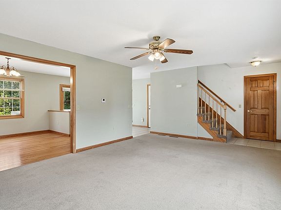 Prime location on a quiet dead-end street, just moments from WNEU. Newer construction delivers peace of mind w/forced-air/central air & energy-efficient windows throughout. Welcoming living room features carpeting & open-concept layout w/seamless sightlines to dining area & kitchen. East-to-west exposure floods the interior w/natural light. Kitchen boasts warm oak wood cabinetry for ample storage, durable tile flooring & double French doors opening to wood deck & backyard- perfect for entertaining or relaxation. Upstairs, the primary suite offers walk-in closet, additional single closet & private bath w/tile flooring, double vanity, linen closet & fiberglass shower. Two additional carpeted bedrooms w/generous closets share a second full bath, also featuring a double vanity, linen closet & fiberglass tub/shower. Lower level includes a finished family room, plus abundant storage and laundry in the unfinished area. An attached one-car garage provides covered parking and extra storage.