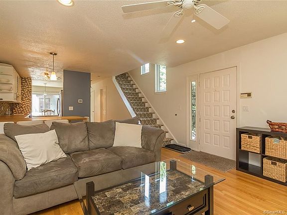 Beautifully updated 2 Bedroom 2 and bath end unit townhouse. Perfectly located with easy access to RT 15, RT 7 and I95 makes this a great commuter location! Enter into your inviting living room with fireplace and recessed lighting. Newer kitchen with butcher block counter top and stainless steel appliances opens to dining area with sliders to newer deck. First floor has a bath. Master Bedroom has hardwood floors and private full bath. The full basement has a high ceiling offering great additional living space potential and houses the washer dryer. Newer Hot water heater and C/A system. This unit is a must see!