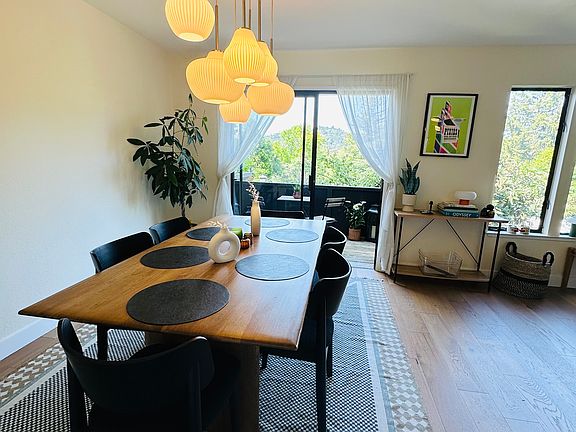Views of mount tam on a private road! Charming 3-bedroom, 2.5-bath Colonial-style townhouse in San Rafael, offering 1,856 sq ft of living space. Features include a bright, open floor plan with hardwood floors, a cozy fireplace, and in-unit laundry. The kitchen is fully equipped with modern appliances, including a dishwasher and microwave. Enjoy stunning city and mountain views, a detached garage with two parking spaces, and access to bicycle storage. Conveniently located in a well-maintained community, walkable to downtown San Rafael. Perfect for comfortable, stylish living in a scenic setting. Big windows, fireplace, brand new hardwood flooring, and right next to beautiful, quiet Gerstle Park! Central heat, brand new washer/dryer and GE appliances, and smart home lights and door. Conveniently located to restaurants, grocery stores, Highway 101, and downtown San Rafael (about .4/.5 mile walk). Dedicated parking spot, off street parking & garage. Amenities: Living room, dining room, TV room, kitchen, porch, and patio with new furniture. Brand new in unit washer and dryer. Brand new hardwood floors and paint. Lockable bedroom and bathroom doors. Designated parking spot and garage. Shared pool. High speed internet. Smart home front door. Two floors. No smoking, small dogs only. Renter responsible for gas, electric, water. Designated parking spot and two car garage.
