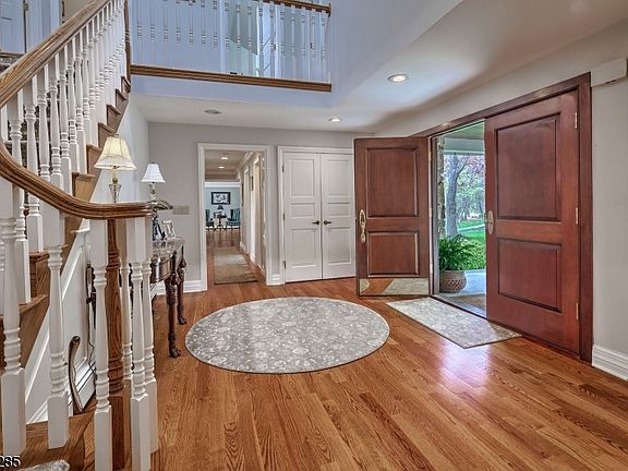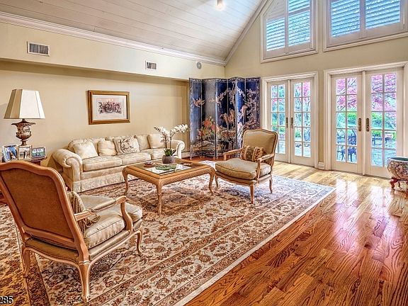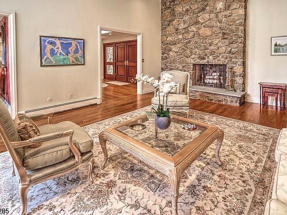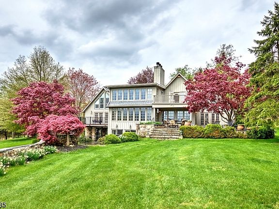 Nineteen wooded and open acres frame this handsome home built in 1978 and updated several times since then. A pond and waterfall mark the beginning of a winding drive that leads to the wood and fieldstone custom residence, nestled into lovely gardens marked by stone walls, sweeping lawns, and stone patios. This site takes full advantage of the peace and quiet of the country setting. A broad pastoral view over treetops and beyond is seen from every part of the house. Handsome mahogany doors open to a two-story foyer with pristine wood floors and a skylight. The living room to the left has a cathedral ceiling with French doors to a stone patio and wall of windows that flood the room with light. A fieldstone wood-burning fireplace anchors the other end of this generous room. An adjoining library has a similar fieldstone fireplace and built-in bookcases, desk, and cabinetry. Three sets of French doors in the dining room open to an additional stone patio, bringing the outdoors in beautifully. A gas-burning fireplace with built-in cabinetry distinguish this room further. The kitchen has a large granite center island with two sinks, Viking six-burner range with two ovens and griddle, Sub-Zero double drawer refrigerator plus standing refrigerator with freezer, a wine cooler, dishwasher, microwave, pantry, warming drawer, as well as a glowing fireplace to gather around and lovely dining area by a wall of windows overlooking the view. Both the patio and deck are accessed from the kitchen. The great room has a wood-burning floor-to-ceiling fieldstone fireplace opposite a wall of windows and French doors to the deck, a wet bar with wine refrigerator, a central sound system closet, paddle fans, and circular stair to the lower level. The first floor is completed with laundry room and powder room. The second floor has a primary bedroom with fireplace, deck access, dressing room with double sinks, compartmentalized walk-in closet, shower and third sink, two additional carpeted bedrooms, one with deck access, and a hall bath with double sinks, soaking tub and shower. The lower level has multiple entertainment rooms-- a billiards room with fireplace, exercise room and game room-- plus a three-season room and wine tasting room, both with wet bars, a full bath and sliding glass doors to the lower patio and outdoor kitchen. There is also a utility room and workshop. With minor changes this area could serve as an ideal in-law suite with level access to the outside. A two-car garage completes the lower level.