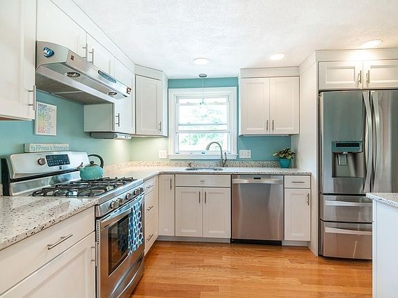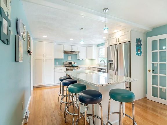This well maintained property boasts four bedrooms, two full and one half bath, beautifully updated kitchen with eat-in dining, formal living room and spacious sunroom. The kitchen has stainless steel appliances and grand center island. The lower level contains a large playroom, half bath, bedroom and laundry area, with access to the attached garage. The rear deck overlooks heated, inground pool, jacuzzi and storage shed. This property is located on a quiet side road with close proximity to Route 128, and within the Dolbeare School district.