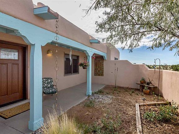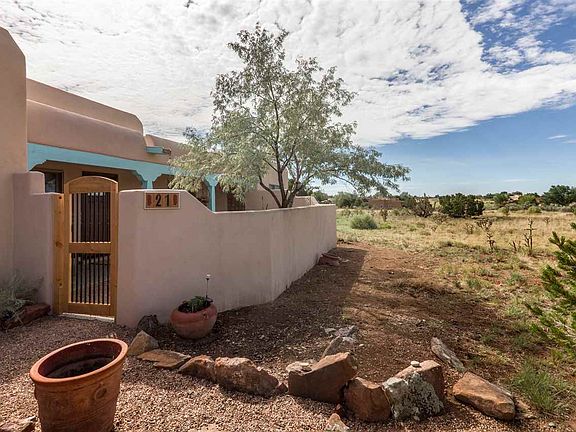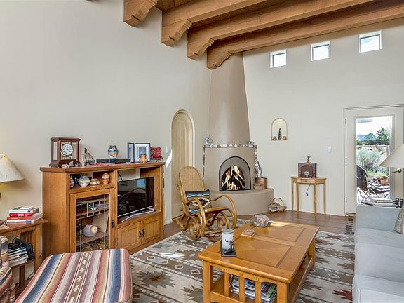Corner lot with views. This open concept home has approximately 1500 sq. ft per the appraisal. There is an additional heated out building with of approximately 120 sq. st. that could be an office, studio, or any creative venture. Basically no hallways, so the rooms are generous. Spacious kitchen with a large island. New range and exhaust vent. Beautiful wood beamed ceilings with corbels. Wood burning kiva fireplace, clerestory windows, in floor radiant heating. The original flooring has recently been replaced with tile in the main rooms and laminate in the bedrooms. Walled courtyard entry. Split bedroom plan.