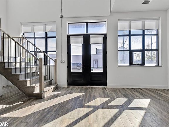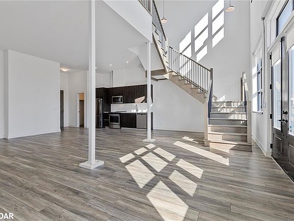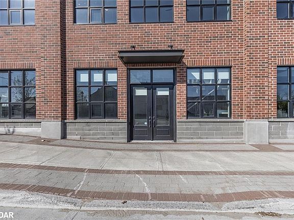 Orillia’s Most Modern & Unique Live/Work Condominium Loft - Welcome to 21 Matchedash Street — where innovative design meets lifestyle flexibility. This highly sought-after street-level unit is part of Orillia’s most exceptional live/work industrial-style condominiums, offering a truly one-of-a-kind opportunity for homeowners and entrepreneurs alike. Step inside through the impressive double doors to a grand 23-foot ceiling entryway that sets the tone for this bright and spacious 2-storey loft. The main level is flooded with natural light from floor-to-ceiling windows complete with custom blinds. The open layout is perfect for professionals needing a polished space to meet clients, or as an impressive living and dining area for those seeking a stylish residence. The main floor also features a modern, well-appointed kitchen, a 2-piece powder room, and convenient inside access to the building. Upstairs, the loft level offers an open-concept family living space with stunning lake views, a primary bedroom plus a den/office, a 3-piece semi-ensuite bath, separate laundry, and a second private building entrance. Residents enjoy exclusive rooftop access with BBQs, lounge seating, and panoramic waterfront views, plus a spacious party room with a gas fireplace, full kitchen, and washroom facilities. This unit includes one underground parking space and a private storage locker. Perfectly situated just steps from Orillia’s vibrant waterfront, marina, restaurants, cafés, and boutique shops, this property is ideal as a year-round residence, a professional live/work space, or your perfect summer retreat. Come experience the forward-thinking lifestyle and energy of 21 Matchedash Street — a must-see to truly appreciate.