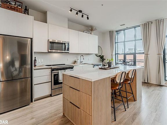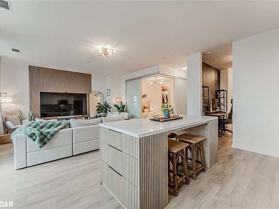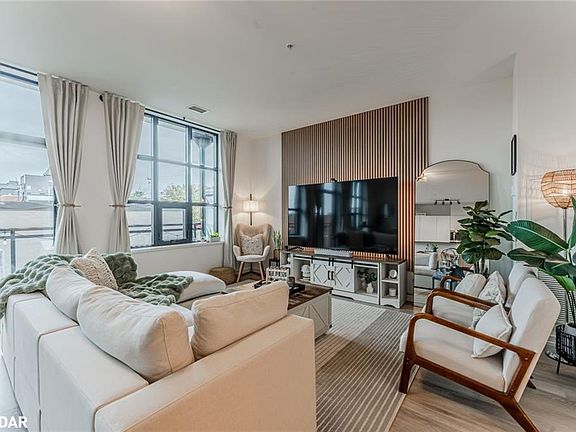 BRIGHT, MODERN CONDO WITH A LARGE PRIVATE BALCONY JUST STEPS FROM THE WATERFRONT! Discover stylish urban living in the heart of Orillia with this beautifully appointed condo, positioned just steps from the waterfront, shoreline boardwalks, the marina, Couchiching Beach, lush parks, and a vast network of walking trails. Enjoy the best of convenience and lifestyle with schools, public transit, and Orillia Soldiers’ Memorial Hospital nearby, plus beloved local spots like Mariposa Market, the Orillia Opera House, Lone Wolf Cafe, Pizza Rustica, Couchiching Brewery, Common Stove, The Social Bar & Lounge, and Studabakers all only minutes away. Set within a newer, well-maintained building, this residence offers premium amenities including a rooftop patio with sweeping water views, two community BBQs, a party room with a kitchenette and fireplace, visitor parking, and secure bike storage. Inside, the inviting open-concept layout unites the eat-in kitchen and living room, highlighted by a wall of oversized windows that flood the space with natural light and a walkout to the expansive private balcony stretching the full length of the unit. The kitchen is designed for both style and functionality, showcasing a newer island with seating for four, generous storage, and contemporary finishes perfect for everyday living or entertaining. The comfortable bedroom features a built-in closet nook with custom lighting and a private 4-piece ensuite, while the versatile den provides an ideal home office or guest space. A second full bathroom and in-suite laundry add everyday convenience. Finished in soft neutral tones complemented by bold black window casings and two stylish accent walls, the interior exudes a cohesive, sophisticated charm, while updated light fixtures throughout bring warmth and polish to every room. Complete with an underground parking space and private storage locker, this #HomeToStay delivers comfort, modern style, and an unbeatable downtown Orillia lifestyle!