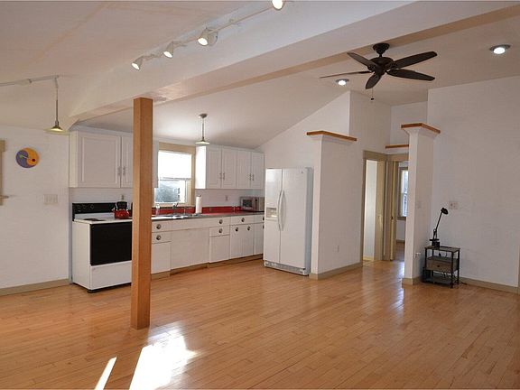 Enjoy the bright, open floor plan and vaulted ceilings in this adorable 2-bedroom, 1-bath home set back behind another home creating a wonderful private setting, in a sought-after location in the Orchard School District. Head up the stairs under a covered entry into this second-story home. You'll find the coat closet on your right with a beautiful curved wall. The entry area opens to the "great room" with beautiful hardwood floors and lots of windows! The "great room" includes a dining area, retro kitchen, and spacious living area, all warmed by a beautiful custom gas stove. There is also a recently remodeled full bath with vinyl plank flooring and two adorable bedrooms, both with mini-splits. The lower level, with a 1-car garage, offers lots of possibilities! Almost double your living space by finishing off this area or turn it into an apartment or ADU, with approved permits and corresponding fees from the City of South Burlington. The space is currently heated and is controlled by a thermostat on the main living level and includes a washer/dryer, on-demand hot water heater, and little desk area. Outside, you'll love the privacy that this partially fenced lot offers with a raised bed for your summer garden, swing set, and nice shed. Convenient location, close to the South End City Market, restaurants and breweries, UVM/UVM Medical Center, downtown Burlington, and more!