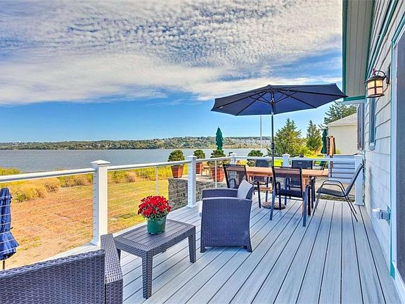 Welcome to 21 Mt. View. This gorgeous waterfront Bungalow is tucked away at the point of the sought after Common Fence Point neighborhood of Portsmouth. This property is completely remodeled and can be purchased with all the stylish beachfront furnishings. The stainless steel appliances, quartz countertops, open shelving, sleek tile backsplash, and fully equipped kitchen are sure to delight! Built with an eye toward low maintenance and longevity, this house has a new heating and air conditioning system, new deck with galvanized steel railings, and open concept living with a cozy gas fireplace in the living room. The first floor features a bedroom with laundry, and the second floor has another bedroom and an office area which you access from a custom, spiral stairwell. This property currently operates as a town permitted Air Bnb with great daily and weekly rental history. Rental history documentation can be made available upon request. Experience Sakonnet River and the beauty of this chic bungalow! Amazing east and west facing views with gorgeous sunrises, beautiful sunsets, and private water access. Enjoy boating, swimming and fishing right in front of your own waterfront retreat. Perfect waterfront retreat! Call today for a private tour.