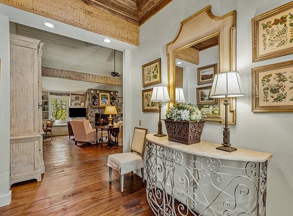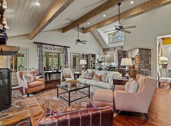 Welcome to this enchanted English cottage just minutes away from downtown Highlands. This picturesque retreat boasts a convenient single-level layout, accentuated by wide-planked hardwood floors that offer timeless elegance throughout. Step inside to discover a welcoming atmosphere, heightened by the inviting vaulted ceiling that creates an airy feel. Embrace cozy evenings by the warmth of not one, but two stone fireplaces - one nestled in the inviting great room and the other found within the expansive sunroom, offering ample space for relaxation and entertainment. Enjoy the seamless flow of the open living area, perfect for gatherings and everyday living. The master suite indulges with not one, but two bathrooms, ensuring utmost comfort and convenience. Additionally, a convenient wet bar adds a touch of luxury to this already enchanting abode.