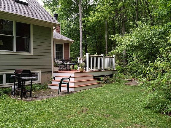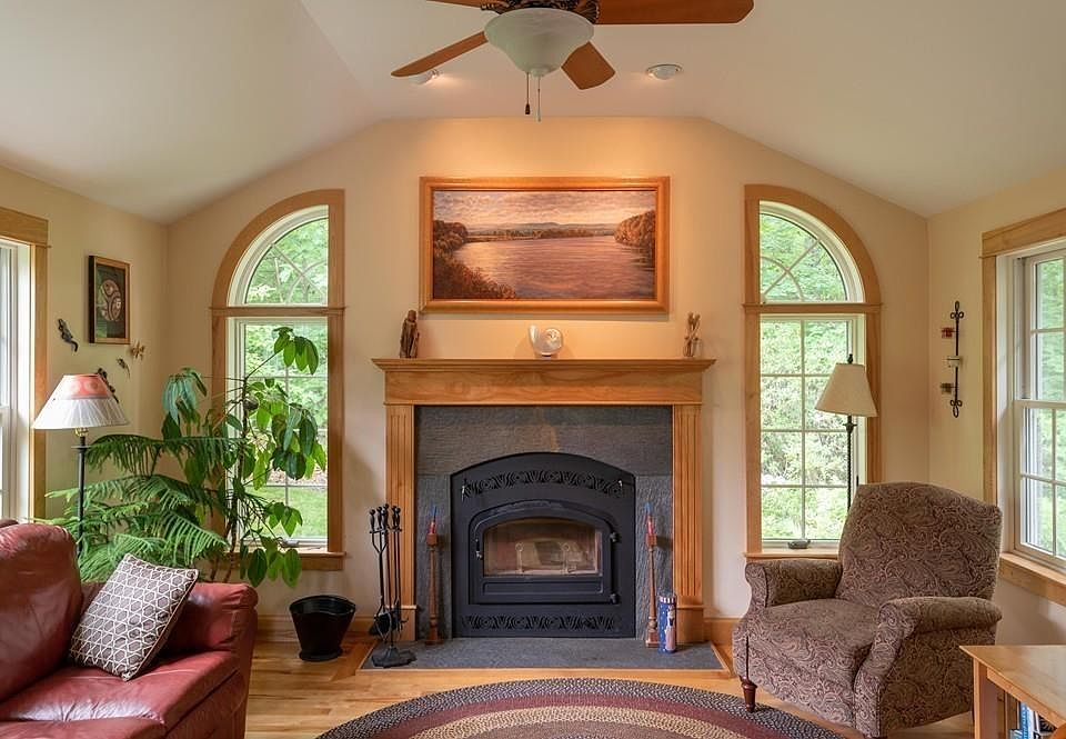 Achieve sustainable and community-minded living in this generous and warm-spirited energy star rated contemporary in Northampton's long-established co-housing community. Set gently amidst the winding paths and mature woodlands and abutting the local bike path, this spacious home offers soaring spaces and inspiring architectural detailing with custom wood trim. Off the multi-skylighted family room is an up-to-date open plan kitchen/dining room and an addition of a charming lofted living room with a large slate fireplace and rows of windows looking out on lawns, deck & woodlands beyond. 1st floor BR and full bath down w/an additional 3, uniquely configured BR's and/or office spaces. A well-finished basement offers additional living space w/separate workshop/artist studio. High quality materials throughout, including a renovated kitchen w/granite counters & tile floors. Live just miles from Downtown Northampton in a community setting with gardens, trails, playground,community hall.