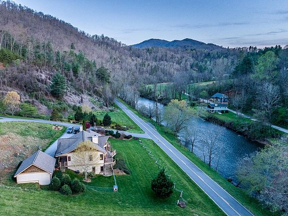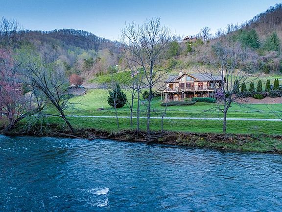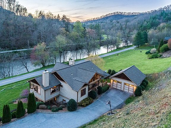 Your family will love this river view gated community! Nestled between the majestic Smoky Mountains & the Tuckasegee River. Paved roads to the door for easy year round access. The main level open floor plan, boasts cathedral ceilings, plenty of natural light and a stunning stone fireplace. The modern kitchen has a large granite island, perfect for entertaining. Beautiful outdoor living space with stone fireplace & covered deck allows for the opportunity to be one with nature! Large front deck offers breathtaking sunsets. 2 of the 3 bedrooms are located on main floor both with en suite bathrooms. Follow the custom made banister to the lower level & you'll find the downstairs family room. Fully equipped with a kitchenette, including custom cabinets & a dishwasher! You'll find a spacious bedroom for guests, as well as a full en suite bathroom. Working from home? Imagine an office that opens up to a stone patio and looks out onto the Tuck. High speed internet available. The laundry room & additional full bathroom complete the lower level. A stone patio surrounds the lower level with well-established landscaping. Fenced area perfect for children or pets.