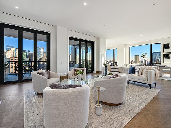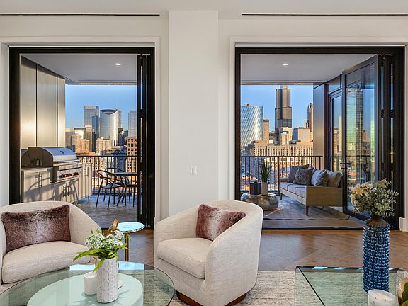 Welcome to the FIRST RESALE in the epitome of luxury living at the EMBRY, the hottest new construction in Chicago's vibrant West Loop neighborhood. This exclusive residence, developed by Sulo Development, stands as a testament to luxury and sophistication, with interiors envisioned by the renowned Kara Mann. The highly sought after, sold out, Southeast corner gem, offers unparalleled unobstructed views of the city, making it a coveted address in the West Loop. Boasting 4 bedrooms plus a den and 4.1 bathrooms, this 3947 square foot home is a masterpiece of design and functionality. It is the only unit in the building with two featured walls of accordion doors that seamlessly connect the indoor space to an incredible terrace featuring a built-in 42" Wolf gas grill-a dream for those who love indoor/outdoor living and entertaining. The Chef's kitchen is adorned with Bovelli cabinetry, professional integrated appliances, and an oversized island with seating. The residence includes a Butler's pantry with custom floor-to-ceiling cabinets, three Subzero wine towers, a wet bar area, and an additional dishwasher. The living room boasts custom wide plank herringbone pattern hardwood floors, and built-ins framing a gas fireplace with a custom honed Bianco Arabescato marble surround. Private elevator leads to elegant herringbone entry foyer and access to the oversized custom organized mudroom. The private primary suite is a sanctuary of comfort, featuring multiple closets, including a custom organized spacious walk-in. The marble primary bath exudes opulence with a furniture-grade double vanity, free-standing soaking tub, and a walk-in shower with a custom glass enclosure. All bedrooms are en-suite and have the most incredible views including a fourth bedroom strategically placed in this split floor plan, ideal for guest quarters. This home is brimming with upgrades, and it comes with two indoor side-by-side garage parking spaces. Wide plank hardwood floors and custom automated room-darkening roller shades in the bedrooms and sheer roller shades in the living areas add a touch of modern convenience. Embry offers a suite of lifestyle amenities, including 24-hour door staff, an open-air firepit oasis, an indoor/outdoor fitness center with a putting green, a luxe owner's lounge and pet amenities including a dog run and spa.