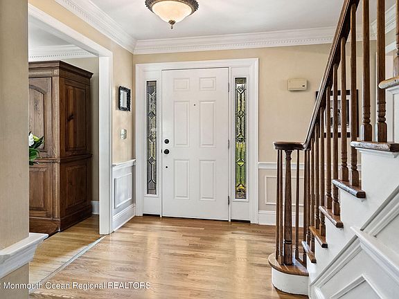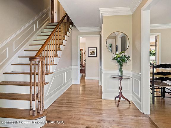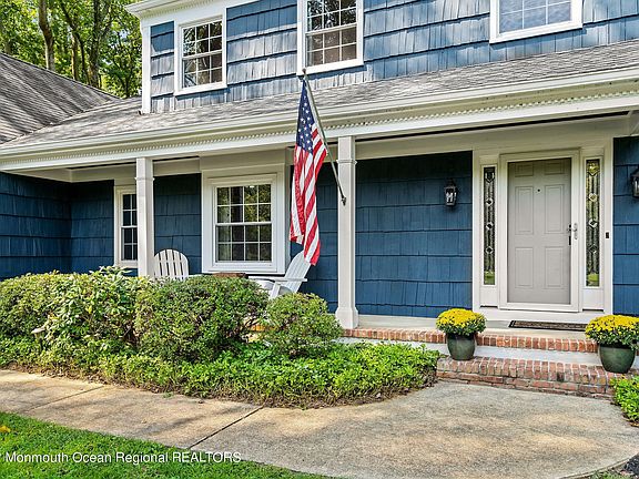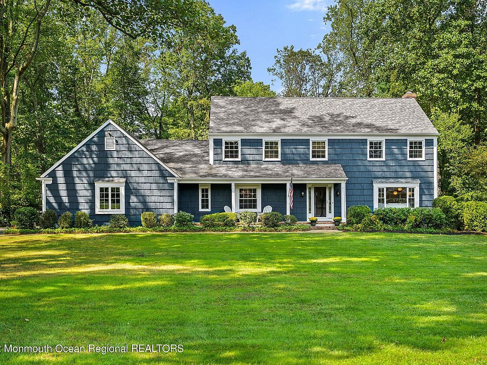 Down a windy country lane you will be delighted by this charming colonial in a serene setting. This gem is situated on a 1.35 acre lot with a wooded backdrop and completely private yard. The home welcomes you with a rocking chair front porch. Enjoy the brand new farm style kitchen featuring quartz countertops, stainless appliances, white cabinetry and sliders to paver patio and beautiful inground pool. Warm and cozy family room with built ins and wood burning fireplace. Owners suite with private bath and 2 walk in closets. Home features hard wood flooring and a 3 car garage with attached ½ bath, perfect for use while in the pool. Garage also has separate entrance to finished basement with an office and family room area. One of the nicest streets in Colts Neck.