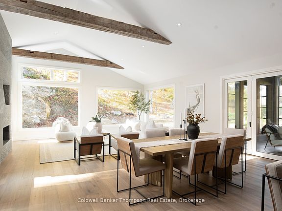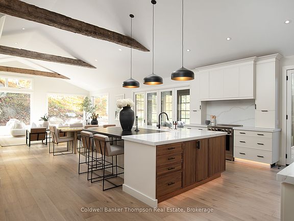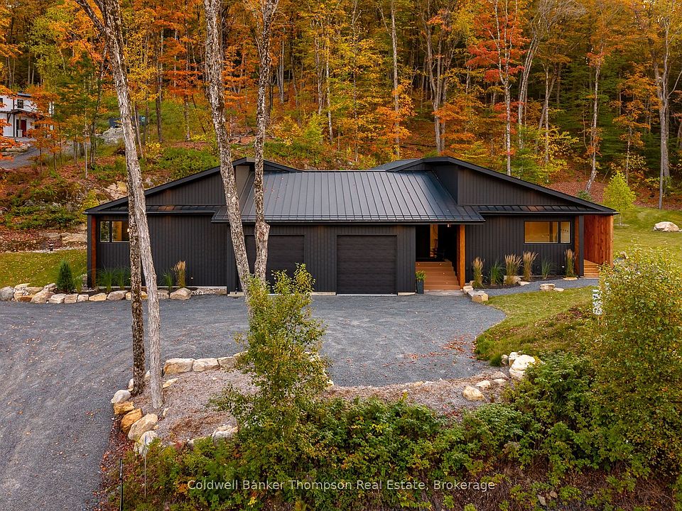 This spectacular bungalow with views for miles exudes sophistication. Set on a spacious level lot over 4000ft of meticulously designed living space awaits. Boasting soaring ceilings throughout leading to the heart of the home is an awe-inspiring custom kitchen featuring premium appliances, sprawling quartz countertops & oversized island crowned with an exquisite custom maple surface for dining. Eye level beverage fridges highlight the bar area with 2nd sink. Entertaining is breeze with the Secret Butler's Pantry! Complete with 2nd dishwasher, ample counter space, cabinetry & 3rd sink. The huge adjacent living/dining area with reclaimed hand hewn beams warm the space alongside the modern stone floor-to-ceiling gas fireplace. A 12ft accordion door opens entirely to the Muskoka Room creating an indoor outdoor sanctuary, perfect for hosting in style. Covered entry ways keep snow off the steps leading to a massive mudroom complete with washer & dryer & a granite composite sink set in maple countertops alongside huge island with seating. Each of the 3 spacious guest suites offers unparalleled comfort, with private or semi-private ensuites, all adorned with heated floors. The primary suite is a true retreat, featuring a massive walk-in closet & 5-pc ensuite, also with heated floors & curbless shower, offering a spa-like experience. Outside, the iconic Muskoka rockscape is masterfully highlighted by strategically placed accent lighting & outdoor speakers, easily controlled from your smartphone. Also boasting oversized garage doors, extra garage depth for toy storage, & could structurally accommodate a hoist. Hop on your ATV and ride from your driveway! The home is roughed-in for a Generac generator & features a sleek standing seam metal roof. Situated across from a pristine nature sanctuary with 4km of scenic trails, this estate offers an ideal balance of luxury living & outdoor adventure, with premier golf, skiing, & boating just mins away. Be sure to check out the video!