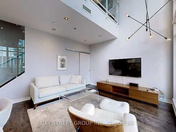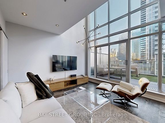 Stunning south-facing 2-storey upper penthouse with dramatic floor-to-ceiling windows flooding the space with natural light. Features an oversized 240 sq ft terrace with BBQ-perfect for entertaining. The main level offers an open-concept layout with hardwood floors and a combined kitchen/living area. The second-floor primary suite includes a dedicated office area, a walk-in closet, and a spa-inspired ensuite. Comes with Tandem 2-car parking and Automatic Blinds, All just steps to the subway and Toronto's Financial & Entertainment Districts.