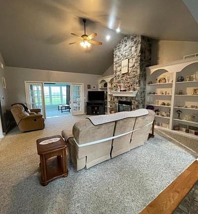 Beautiful home in Royal T Estates. One floor living at it's finest. Upon entering the home you will find yourself in the entrance hall with wood flooring which is open to the large great room with an entire wall dedicated to fireplace and built-ins. To the rear is the four season room filled with natural sunlight. Also open to the great room is the kitchen featuring a large island, built-in wine rack, appliance garage, some pullout shelves and double lazy susans. There is a formal dining room for your dinner parties. Master en suite has large bedroom, two W/I closets, private tiled bath with double vanity, stall shower and large whirlpool tub in it's own private room. There are two other bedrooms and large tiled guest bath on opposite side of home. Tiled laundry is located on main floor for your convenience. Finished lower level has a huge finished area with another fireplace and pool table stays for your enjoyment. Basement also has ½ bath and two storage rooms. Oversized 2 car garage with storage room. Outside you will find a lovely landscaped front yard. A portion of the backyard is fully fenced with a huge patio area. There is a gas line for a grill and large shed included. While relaxing on your patio, enjoy the gorgeous views of the countryside.