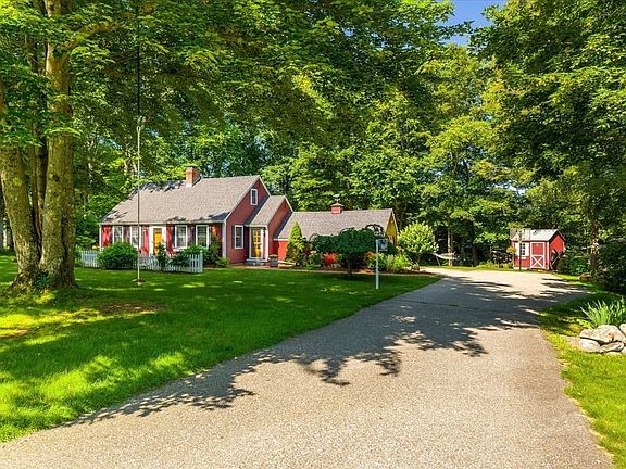 Absolutely adorable! Situated on a charming private lot in the sought after Old Farm Road neighborhood of Sturbridge this 3-bedroom cape style home boasts a variety of great updates including: a new roof and gutters, Granby double wall oil tank, pellet stove, Quartzite kitchen counters, farmer's sink, subway tile backsplash, vinyl plank floors in mudroom and bonus room, and a private patio. Natural light happily fills the entire house, especially the bright eat-in kitchen that opens onto a deck and patio area nestled into the private backyard. The first floor flows nicely between the kitchen, dining room, living room, and mud room. Find even more space in the bright and comfortable finished basement. The unfinished portion of the basement includes a workshop and room for storage. Attached garage, 2 sheds, fun play structures, ample parking. Bonus: the picturesque rope swing stays with the home! Well-rated schools. Easy access to major commuting routes.