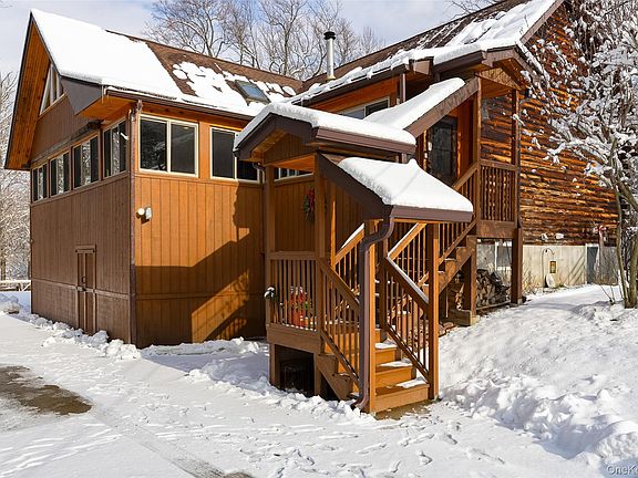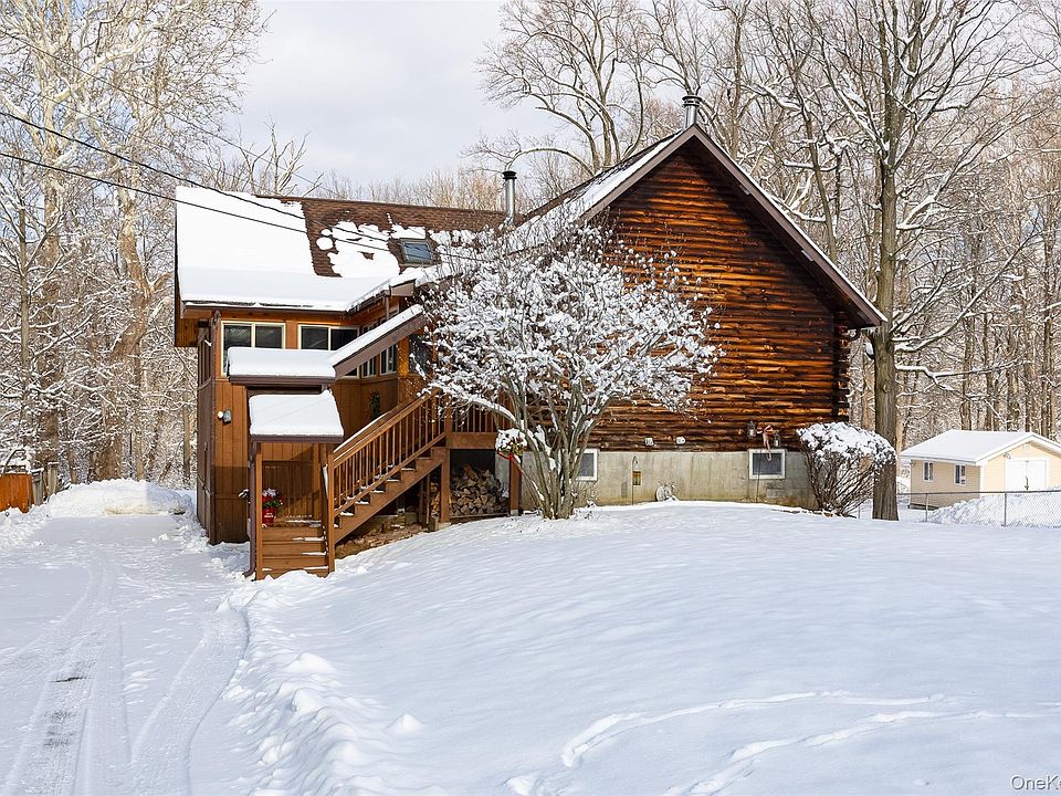 This custom built Log Cabin was built with love for the same family that stills resides. The 3 bedroom & 3 Baths Log Cabin style home is set back from the street & has a wonderful over sized rear paver patio overlooking the sprawling back yard. The floating beams placed throughout the home, solid wood interior doors, a custom built floor to ceiling stone fireplace & custom woodworking throughout makes this a true find. There is a large open eat in kitchen which opens to your dining room & spacious Livingroom with vaulted ceilings makes for a perfect evening gathering, Holidays or Sundays best! 2 of the 3 bedrooms are just around the corner along with the 1st full bath. The loft works as the perfect place for your home office while keeping an eye on what's happening downstairs. The primary suite is tucked away on the 2nd floor alone with wonderful privacy, a sitting room to the side & your own Primary bathroom with a large soaking tub. Downstairs in the basement has tall ceiling, great storage plus your 3rd full bath with a tiled shower, access to a work work & all the mechanicals plus access to your rear yard for an added convenience. Multiple skylights bring in an abundance of additional natural light. The roof was replaced in 2014, Hot water Heater 5 years new & the septic has been recently inspected & emptied for the new owners. Towards the back of the yard sits the Fishkill Creek & you can hear the water flowing seasonally.