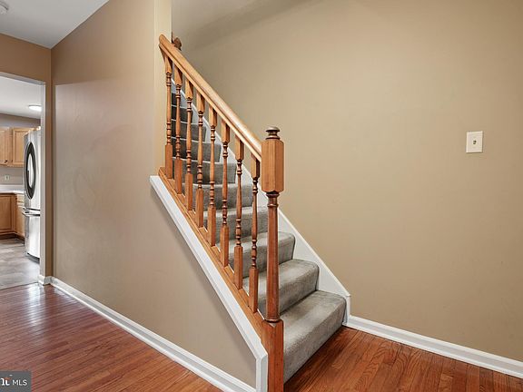 Freshly painted and very nicely maintained, this lovely 3 bed, 1.5 bath end-unit townhome enjoys wooded views from the covered porch, the back deck and most windows. With over 1300+ sqft, it is nestled in the quiet section of Gable Park Woods know as The Enclave. This move-in ready home is spacious on the inside and also boasts various outdoor areas to relax and gather. Inside, the main level features hardwood flooring at the entrance, well-sized rooms with window blinds, mostly carpeted floors with vinyl in kitchen, laminate in dining room and a convenient half bath. The sizable living room-dining room combination flows to the pleasant oak kitchen with newer, upgraded SS appliances (Miele, GE, all appliances convey). The kitchen and dining room extend outdoors through two sets of glass French doors (new screens) onto the generous deck with views of mature trees and a side-panel for privacy on one side. Upstairs, discover three nicely-sized bedrooms (one with new carpet) and full bathroom. The primary bedroom, with vaulted ceiling and ceiling fan, connects directly to the full bath with vaulted ceiling and skylight, tub/shower combination, large corner sink/vanity area and a linen closet. This home has a BONUS: the unfinished, walk-out lower level with a large window and another set of glass French doors to the backyard. Currently the laundry room, the bright lower level would be perfect for a variety of uses with level access to the outside. Bring your creative ideas for designing the lower level of your dreams! With two parking spaces directly in front of the home on this quiet cul-de-sac, you could always be a short, peaceful walk to your front door. Don't miss your chance to see this gem! One year home warranty included.
