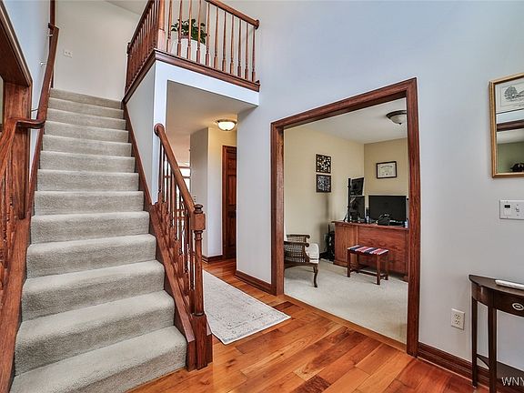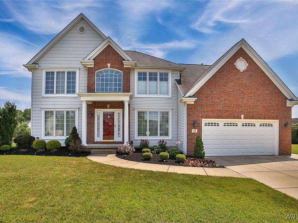 Welcome to 21 Pennington Court located in Lake Forest North and the award winning Williamsville school district. This 2840 sq ft Forbes built brick and vinyl beauty has been lovingly maintained and enhanced by original owners. Classic dining room and office flank the two story foyer. Freshly painted throughout! Open concept kitchen with newer stainless appliances, granite counters, hardwood floor and walk-in pantry. Convenient first floor laundry. Morning room with wall of windows and door out to an expansive professionally landscaped yard. Great room with gas insert fireplace, hardwood floors, vaulted ceiling with wall of windows overlooking stamped concrete patio with professionally cleaned and stored Custom Canvas awning for outdoor dining and entertaining! 90 x 250 lot on pond with trex dock, reinforced waterfront, fully fenced yard surrounding in-ground fiberglass pool + spa + outdoor kitchen + shed. Primary bedroom with cove ceiling, custom walk-in closet plus glamour bath with jetted tub + oversized shower, double sink vanity. Three additional bedrooms with generous closets. Other room 1 is morning room, other room 2 is office. Updates: refrigerator, stove and microwave in past 5 years, furnace 2025, hot water tank 2022. Sellers are building and may need a 60 day+ closing. Easy access to 990 and conveniences.