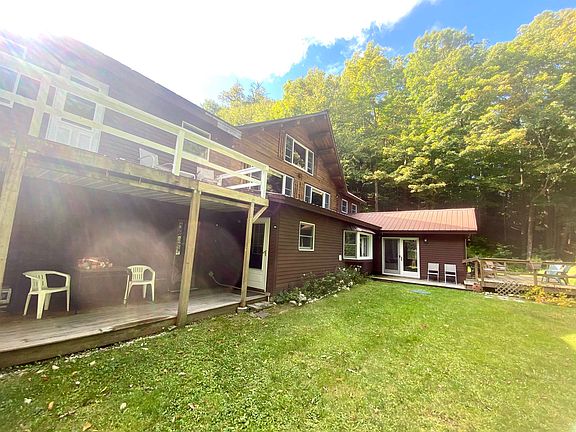 Don't miss out on this opportunity! This log home is perfectly situated up the road from Mt. Snow and just minutes from Stratton. 3 bedrooms and a loft space allows plenty of room to space out, while still generating income from the 3 bedroom apartment downstairs - or keep the downstairs for yourself if you like and rent out the top space! The top floor boasts large kitchen and living area with an additional living room that allows for plenty of room to spread out, or hang together around the fireplace. The downstairs is more then spacious with 3-bedroom apartment and its own private entrance and deck. The yard is beautifully landscaped with mature flower beds, two fire pits, a small pond, a large garden shed, detached carport and a two bay attached heated garage. Last, but not least–a Jamaica Cottage Shop Cabin sits on the property that is equipped with a wood stove, kitchen, bedroom and screened-in porch. This is a unique property with a fantastic rental history, with the ability to keep space for your own enjoyment. (Upstairs kitchen area and garage were added in 1982. Addition of one of the upstairs bedrooms and apartment built in 2006, Jamaica Cottage Cabin built in 2004)