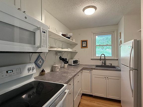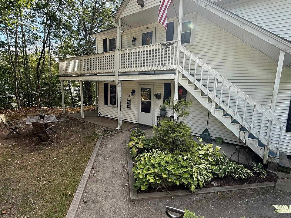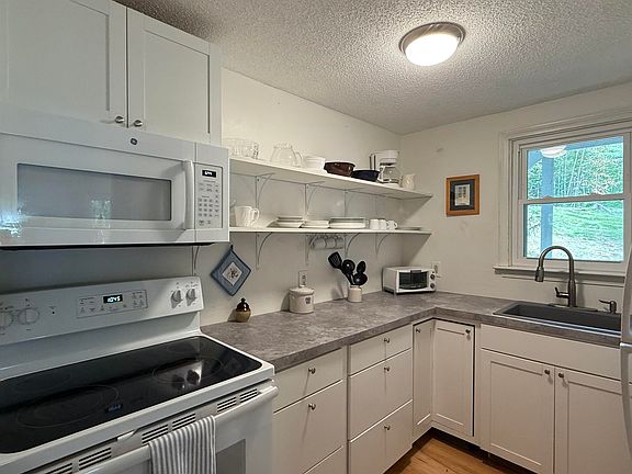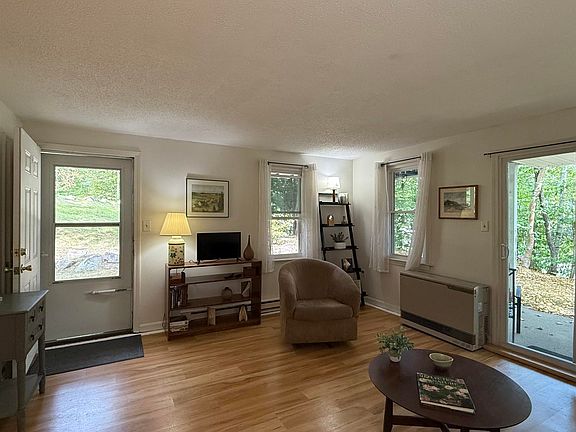 Thoughtfully renovated since its 2018 purchase, this inviting and private condo offers comfort, efficient systems, and a peaceful setting—making it an ideal full-time residence or income-generating rental. The kitchen has been fully remodeled with new cabinetry, countertops, and appliances, while the primary suite features a redesigned bath complete with a spacious 5-foot walk-in shower and ADA-compliant toilet. Hardwood flooring runs throughout the living space, complemented by fresh paint on walls, ceilings, and trim. A stacked washer and dryer, new hot water heater (2019), and updated combination windows add even more ease of ownership. In 2025, additional improvements were completed, including a new vanity and sink in the second bathroom, brand-new carpet in the primary bedroom, and a full roof replacement on the building. A high-efficiency Rinnai propane heater serves as the primary heat source, with electric baseboards as backup. Thanks to its wooded surroundings, the unit stays comfortably cool in summer—rarely requiring A/C. Tucked into one of the most private locations in the association, the home enjoys tranquil wooded views and a shared yard with only one neighboring unit. A covered patio offers year-round outdoor enjoyment, along with space for gardening or relaxing. Whether you're seeking a turnkey home or a part-time residence with proven income potential, this condo fits the bill.