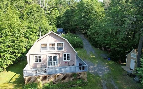 Rare opportunity for 200 ft of waterfront on Lower Wilson Pond with over 5 acres of land and a 2 car garage! With a stunning view of Rum Ridge this off-grid home features a private well and septic, multiple outbuildings for storage, solar system with backup propane generator and gazebo near the waterfront. Snowmobile trail accessible, please see last picture!
