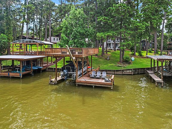 Beautiful, recently renovated lakefront home on an inlet of Lake Livingston with stunning views. Surrounded by tall pines, this 3BR/2BA retreat features a double-decker boathouse dock, outdoor fireplace, and multiple decks for outdoor fun. The upper level offers an open-concept kitchen/living area, two bedrooms, and a full bath. Downstairs includes a spacious second living area, one bedroom, and another full bath. Both levels have wraparound decks with ample seating—perfect for outdoor dining and relaxing. Great spot for a weekend escape, fishing, or continued short-term rental use. Sold furnished.