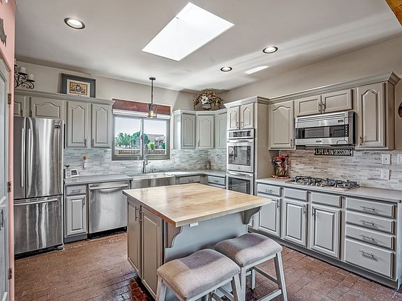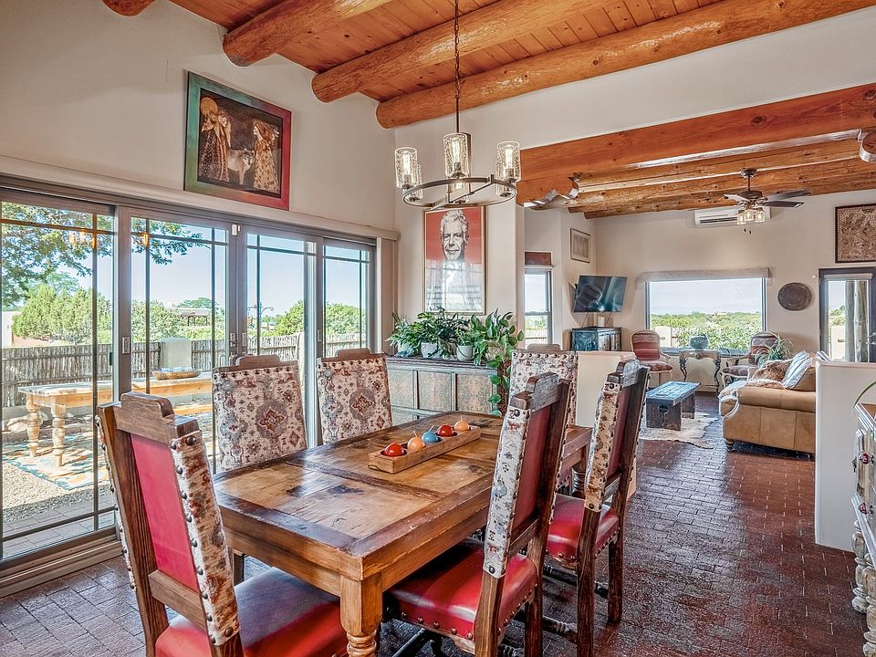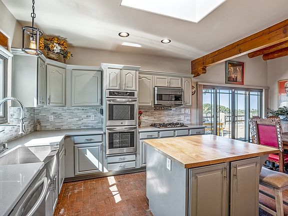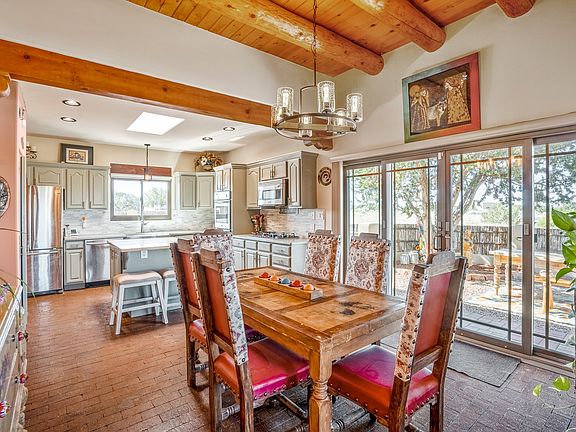 This Spectacular and Modern Santa Fe style home located in the heart of Eldorado offers spectacular visibility of four mountain ranges and big Sunsets skies from indoors and outdoors year round. This move in ready 3 bedroom, 2 bath home sits on a 1.38 acre of big-sky desert views, perfectly framed by every window and located at the end of a quiet and private cul-de-sac and situated along the Old Santa Fe Rail Trail. Current updates (2019-2023) include: Anderson sliding doors in the dining room, Coyote fencing overhead (portal), a new Water Innovations (whole home) water purification system, installation of four ductless/AC mini splits, a new boiler, all new stainless steel appliances, installation of Anderson Replacement windows with top of the line Fibrex, new skylights, and the addition of a beautifully landscaped flagstone patio and water feature.