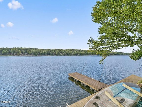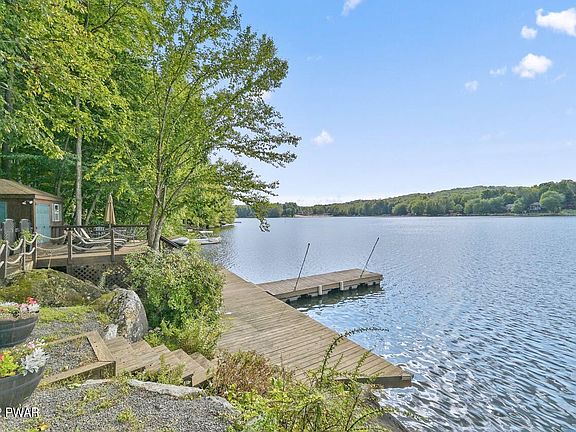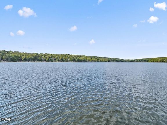Gorgeous POWERBOATING LAKEFRONT HOME nestled on a private wooded lot of nearly an acre in The Hideout, a gated community located in the Northern Poconos, just over 2 hours from the NYC and Philadelphia areas. This well maintained 4 bedroom, 3.5 bathroom home offers true lake living with 160 feet of lake frontage, awesome lake views, a dock and boat slip. Recently remodeled and updated, new flooring and paint throughout. Beautiful entry foyer, open kitchen/family and dining room with stone fireplace. Every room in this exquisite home has breathtaking lake views! Primary bedroom en suite bath and beautiful soaking tub with waterview and an impressive custom walk in closet. Walk out to the amazing screened porch, with high ceilings and stunning lighting perfect for watching the sunset from this west facing stunner! There is a large deck with plenty of room for entertaining, endless possibilities! The walk out finished lower level features a large family/recreation room. The room sizes are all spacious and there's plenty of storage. Lakeside deck area and shed