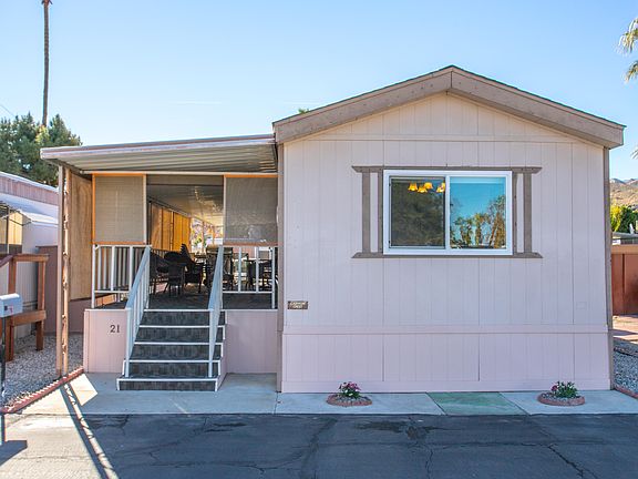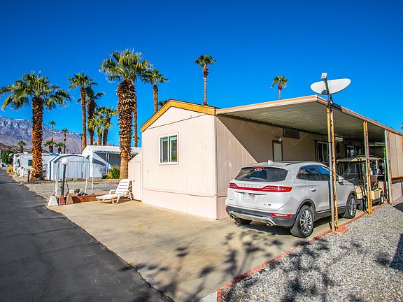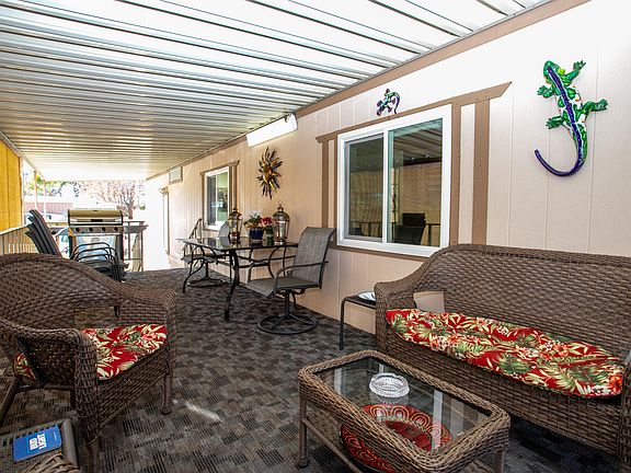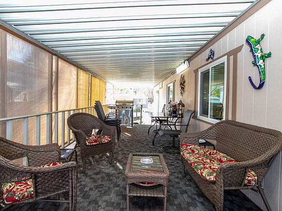 Back on the market, buyer didn't qualify. Great Single Wide with loads of upgrades. Large two bedroom with beautiful raised front patio deck with wicker patio furniture and sunshades. Amenities include dual pane windows, and covered carport with golf cart. Remodeled Bath with tile floors and new vanity, Washer dryer included. Vaulted ceilings in the living room with plush full sized sofa, loveseat and ottoman. Kitchen features include breakfast counter, tile floors and and stainless dishwasher and stove. This one won't last long, so come and get it.