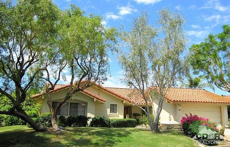Jewel of the Desert - Desert living at it's best. First time on market, this charming home features 2 Master suites with ensuite baths, 1 half bath, private pool/spa with spectacular panoramic mountain views located on an interior raised lot in low density 66 home community of San Marino, located in the heart of Rancho Mirage. Surrounded by million dollar homes and across the street from the prestigious Mission Hills Country Club. The home features solar panels, energy efficient, high ceilings, French doors, plantation wood shutters throughout, Living room fireplace, mirrored wet bar, neutral paint tones, screened Florida room off dining area, ceiling fans, recessed lighting, custom built-ins, extra large side yard w/fruit trees are just a few of this home's amenities. HOA includes front landscaping, community pool/spa, two tennis courts and cable TV.