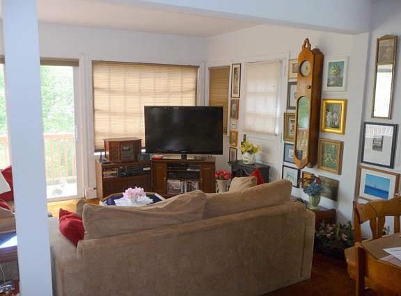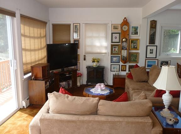 Charming 3 story cottage home includes a spacious library with built-ins and sliders leading to a deck which extends the width of the house. Lake views can be seen from a living room and dining area leading into a galley kitchen w/2 pantries. This provides lots of light and a view of mature flowering trees, shrubs, and beautiful foliage. Large master bedroom has two closets. Relax on a new patio in the private backyard. Walk to beach and enjoy all the amenities Lake Carmel has to offer.