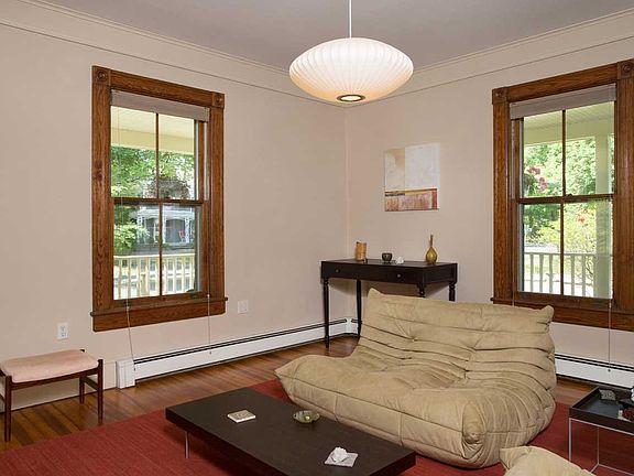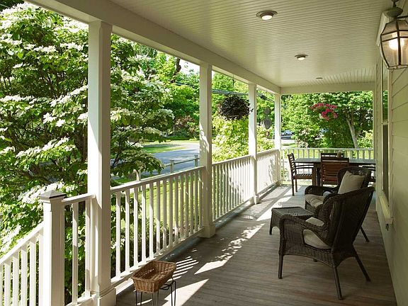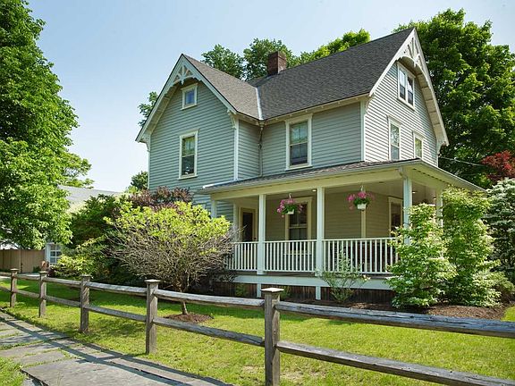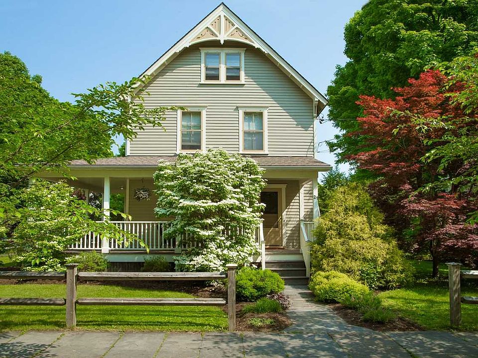 Close to the center of the village this home is ideally located to enjoy all the activity in the Village. The split rail fence and beautiful mature gardens create a buffer from the sidewalk, as does the lovely mahogany wrap around porch. High ceilings, beautiful windows, fir and oak floors, create an open and airy atmosphere. A private feeling blue stone patio surrounded by gardens and tucked between the barn and the back of the house leads to the mudroom and full bath. The dining room, living room and kitchen with a breakfast bar flow nicely together. Upstairs both bedrooms are spacious. The library or guest room is cozy while the additional office space opens to a great walk up attic with plenty of room and windows on each end. The detached 2-car barn/garage has an exterior staircase opening to a wonderful loft like area. This is a lovely village home.