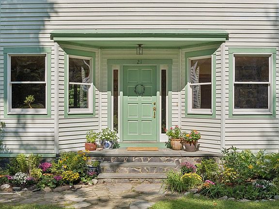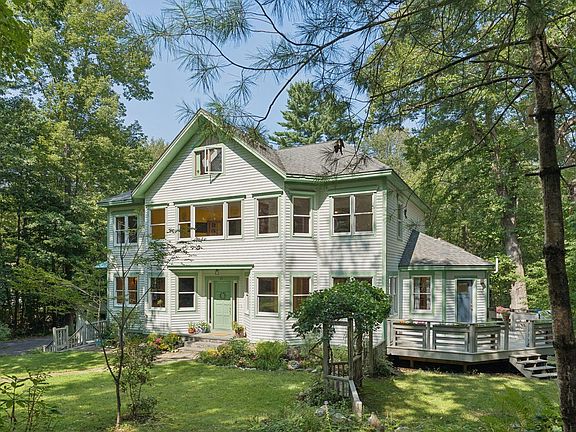 Outdoors, the setting is both pastoral and enchanting. About an acre of open lawn—carefully maintained without pesticides—frames the home, bordered by historic stone walls and perennial plantings including lilacs, lilies, azaleas, rhododendrons, irises and blueberries, while three wooded acres behind the lawn feature a children's cabin, a three-season pond, and a winding footpath that leads to a secluded overlook.