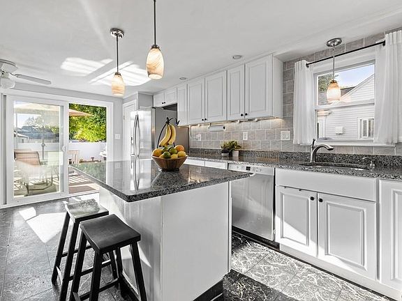NORTH WEYMOUTH OAISIS ; This cape home sits on a picturesque side st. with fleeting water views. Brilliant use of space feat. 3 full bdrms & 2 baths. Main level wraps around an open stair w/ skylight above, flowing effortlessly from living to dining and into a renovated kitchen w/ island + separate eat-in counter. Kitchen is flooded w/ light through glass sliders behind which you'll see your deck and the inviting waters of your INGROUND POOL. Private, fully fenced yard offers plenty of space to bring the party outdoors or simply enjoy the breeze coming off the water just down the block. Main level updated bath and bdrm, upstairs two evenly sized bdrms offer seating areas nestled into the dormers. Lower level is partially finished w/ enough space for a family room/guest suite & features a bath w/ shower. 2014 Central Heat + AC, updated elec., NEW hot water tank, range, DW. NO FLOOD INS REQ! Make this quintessential cape yours this summer & enjoy a full season of memories by the water!