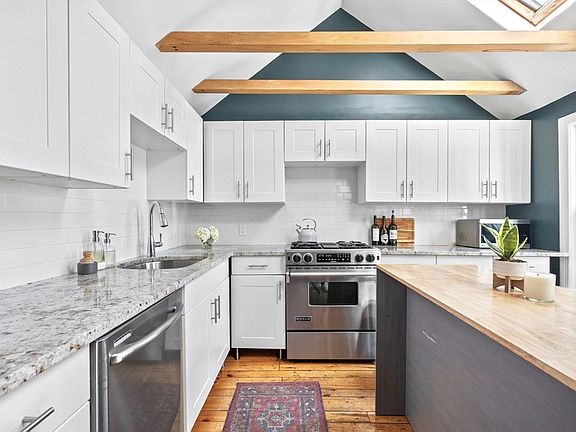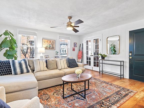 Rarely available duplex penthouse with private roof deck! This spacious 2 bed + Office provides an idyllic floorplan with incredible natural light, 3 sides of exposure, and detail throughout. Large and dimensional living with centered fireplace and room for full-size sectional. Designer kitchen features vaulted ceiling, exposed beams, custom cabinetry, and adjacent formal dining. Primary bedroom offers space for a kingsize and generous closets. Guest bed is ideal for the growing family. Oversized modern bath with tile surround shower. Dedicated home office with handcrafted shelving and french doors. Enjoy the seasons and summer nights on your large, and direct access, private deck! Pine floors. Laundry. Basement storage. Coveted location. A fleeting opportunity to own a beautiful piece of historic Charlestown!