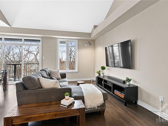 This stunning 2-bedroom, 2-bath upper end unit with cathedral ceilings, boasts a picturesque location backing onto greenspace. This home feels like a new build featuring an open concept layout with stylish finishes, high ceilings, and an abundance of natural light pouring in from large windows on 3 sides of the condo. The hardwood floors flow throughout the entire home, no carpet! The open concept kitchen is complete with granite countertops, an island/ breakfast bar, & stainless-steel appliance. Step out onto thewood tiled balcony and take in the serene views of nature. The Primary bedroom features a 3-piece ensuite and a walk-in closet with plenty of storage space. The additional bedroom is bright and spacious with extra lg closet. Other highlights of this desirable property and Barrhaven location, California shutters & parking at your door. Located just steps away from Transit, shops, restaurants, schools, parks, & trails, this fantastic location has it all!