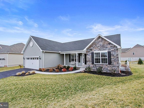 Lovely 1,760 SF rancher located in Cumberland Village development just a few miles west of Gettysburg, PA. This 3 bedroom, 2 bathroom open floor plan home was built in 2017 and boasts wood flooring, vaulted ceilings in the main living areas, 20x5 front covered porch, bright & spacious sun room, ceiling fans, maintenance free 21x12 deck with a newly installed (fall 2021) awning, 15x14 kitchen (recessed lighting, stainless steel appliances, granite countertops, center island with seating, pantry), nicely sized primary suite with walk-in closet & full bath (walk-in shower, linen closet), separate 1st floor laundry room w/pocket door. Generously sized 33x27 unfinished lower level with poured concrete walls, gas furnace, gas water heater, sump pump, water softener, 200-amp electric, man door to walk up steps. All kitchen & laundry appliances, and window treatments convey with the property. $250 one-time capital contribution fee due at settlement, $250 per year HOA dues cover common area maintenance & HOA insurance. Seller believes the property to be in very good condition, but is selling AS-IS. Wonderful Home, Come See!