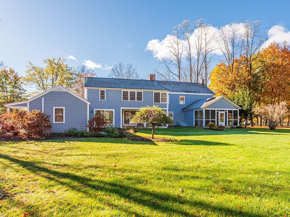 Historic colonial built by Enos Canfield in 1821 sits on 4.89 level acres and is offered for the first time in seven decades. This 4,447 sqft home has many fine features including: five bedrooms, four bathrooms, three Rumsford fireplaces, radiant floor heating, hardwood and softwood flooring, alarm system, and two car attached garage. Wonderful first floor plan design offers formal living room with fireplace (38x15), cozy den/office with fireplace, family room with fireplace plus floor to ceiling built-in bookcases (19x13), formal dining room has wains coating and pine floors (19x13). The kitchen has Corian counter tops, stainless appliances, crown molding, maple flooring, and a sliding double door to a bluestone patio. The remainder of the first floor includes a power room/laundry, mudroom/entry with slate tile flooring, and a guest bedroom suite with fabulous updated bath. The second floor has five bedrooms and two full baths. The primary suite can be accessed by a separate staircase, has a dressing room with cherry built in double bureau and walk-in closet, double vanity sinks and large glass walk-in tile shower enclosure. Outside has a pretty back yard with mature trees and landscaping, blue stone patio, level yard, small detached storage barn with power, perennial gardens, and covered storage. This is what Vermont is all about, a historic home, updated kitchen and baths, well maintained and truly loved.