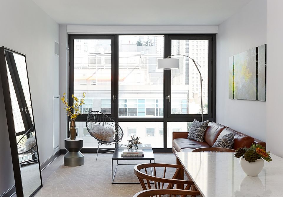 Cutting-edge, designer interiors feature extensive layouts, Canadian white oak floors, and floor to ceiling windows, generating an abundance of natural light. Modern kitchens have custom millwork, marble countertops and floors, walnut stained cabinetry and state-of-the-art stainless steel Kitchenaid appliances. All units contain Bosch washers and dryers, truly generous closet space, including a walk-in the Master bedrooms and over nine foot ceilings. Residents will also enjoy direct exposure to the Hudson River and panoramic city vistas.