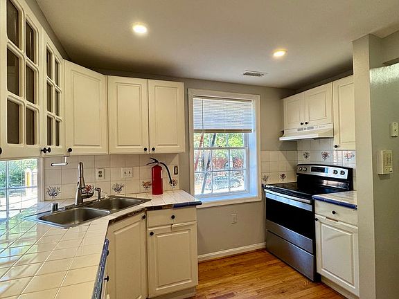 The kitchen is both stylish and functional, offering tiled countertops, a matching backsplash, built-in cabinetry, and a full suite of appliances including stove/oven, refrigerator, microwave, and dishwasher. Preparing meals or entertaining becomes effortless in this well-equipped space.