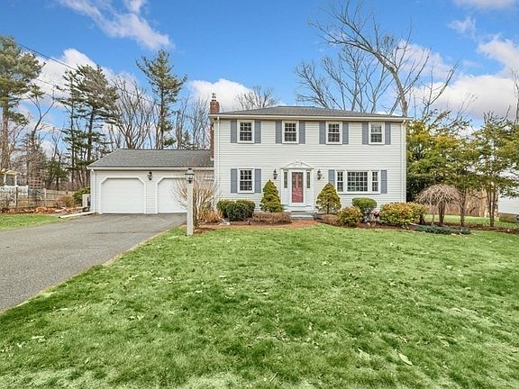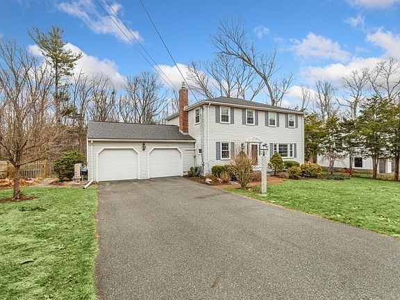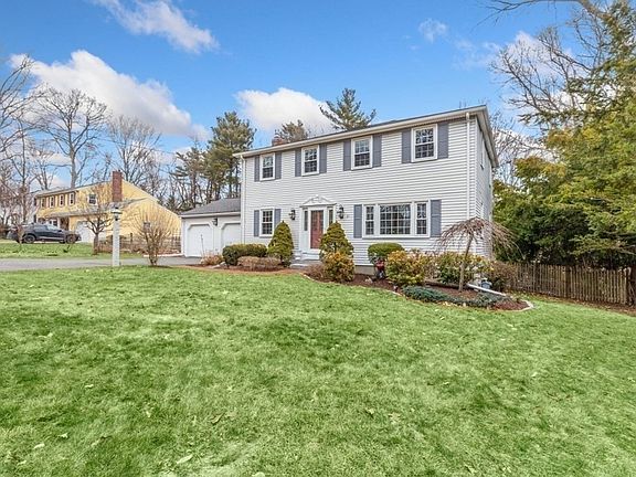 Beautiful! This meticulously maintained 4 bed, 2.5 bath colonial home is set on a quiet cul-de-sac in a popular neighborhood. A wonderful floor plan for entertaining family+friends as well as privacy+tranquility while relaxing poolside. The granite kitchen boasts white custom cabinetry, lots of storage space including pantry+breakfast bar and opens to the den w/fireplace on one side and also opens to the dining room + spacious living room creating a perfect flow for family or guests. Sliding Barn Door takes you to the back wing, which includes 1/2 bath, 1st fl laundry and gorgeous sun filled Nantucket room w/fireplace, vaulted ceilings, skylights+wall of sliders that open to the deck overlooking the beautiful backyard perennial garden views. 2nd fl primary suite w/two closets+updated full bath plus 3 additional bedrooms+newly updated full bath. Lower level Great Rm with bar, cozy gas fireplace stove and walk out to backyard sanctuary of gardens and heated pool. 2 Car Gar. Close to 495
