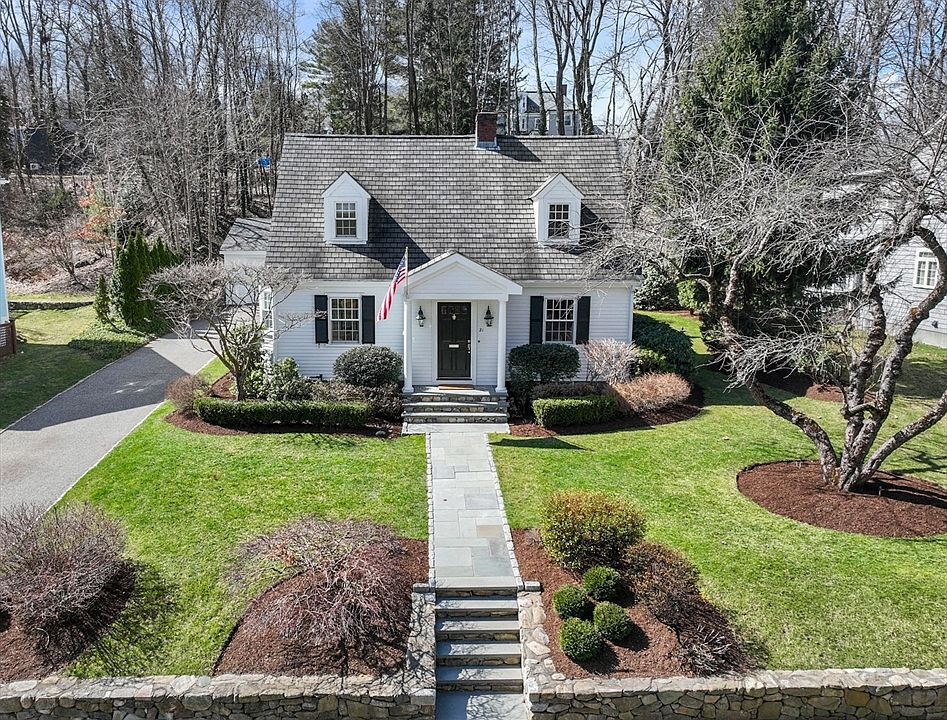 Timeless yet modern, this picturesque Cape in Poets Corner offers open concept living and plentiful space in an idyllic neighborhood setting. Enter through the welcoming foyer and into a sprawling formal living room with fireplace and built-ins: a perfect gathering space. The elegant dining room is sure to host many warm holidays! Showstopper open concept kitchen, eat-in area & family room provides ideal layout. Styled with restrained elegance, the fireplaced family room has built-ins, desk for homework/work from home and large dining space. Double french doors let the sunlight stream in while displaying private, lush backyard. Gleaming kitchen has big island plus seating at peninsula and many chef's features. Second floor primary retreat has vaulted ceilings, double walk ins & updated bath. Two add'l bedrooms and two full baths complete 2nd floor. Lower level has workout room, office, and playroom. With playground, school and shops all less than 1 mile away, you can have it all!