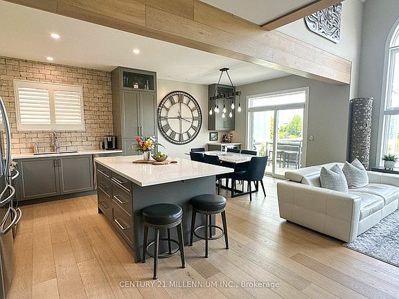 Blue Shores Beachcomber Model - A Must-See Masterpiece. A home that must be experienced to be fully appreciated. Completely re-designed from top to bottom with approximately $400,000 in upgrades since 2019, this stunning residence has been meticulously updated and is ready for its new owners. From the moment you step inside, you'll be greeted by a clear line of sight from the front door through to the oversized windows with breathtaking views of the pond. Glass-railed stairs, open-concept living area, a brand-new kitchen, engineered hardwood flooring throughout a seamless blend of modern luxury and comfort without you having to lift a finger. Most furnishings are negotiable, truly a turnkey opportunity. Main floor features a spacious primary suite with serene pond views, while the loft area houses two additional well-designed bedrooms, bathroom, and glass rail opening the space and adding to the contemporary feel. Relax in the exquisitely appointed sunroom, where slider windows open completely for an unparalleled indoor/outdoor experience, complete with an electric screen for added convenience. The re-designed front entrance and custom patio enhance the homes curb appeal and provide exceptional space for entertaining. For those cozy nights, retreat to the finished lower level, which is perfect for a movie night or a jam session. This level also includes a comfortable rec area, an additional bedroom for guests, and ample storage space. Living in Blue Shores means enjoying freehold living with the added benefits of common elements, including a clubhouse, indoor and outdoor pools, a fitness room, games rooms, tennis, pickle ball, snow removal right to your doorstep, and lawn maintenance. This coveted community is known for its social neighbourhood and pride of ownership, making it the perfect place to call home. Experience the unmatched allure of this Blue Shores Beachcomber Modelschedule your private tour today and discover why this home stands out from the rest.