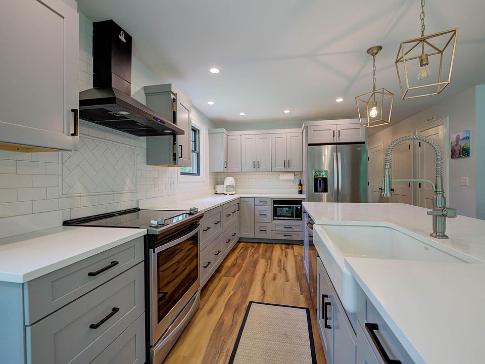 White quartz countertopsNewly paved drivewayElegant gold pendant lightsWell-lit kitchenPrivate bathOver-sized slidersDedicated laundry room